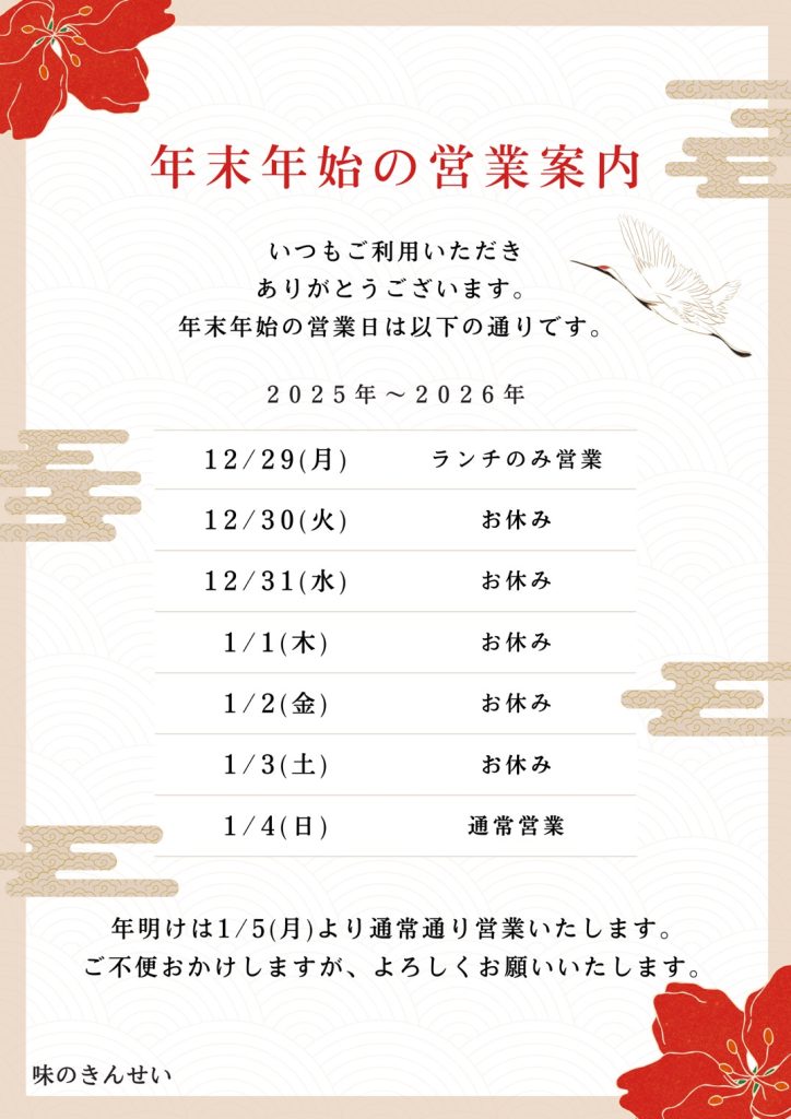 年末年始営業予定